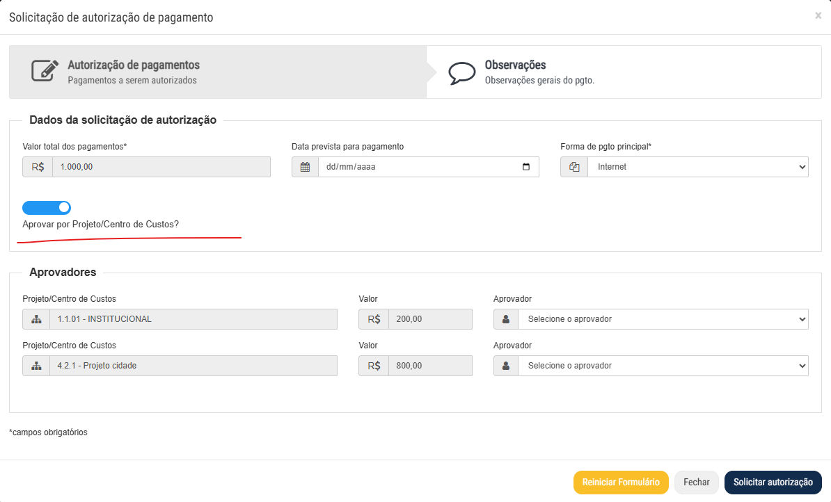 A Autorização de Pagamentos por Centro de Custo permite que um mesmo pagamento seja aprovado por diferentes responsáveis, de acordo com o rateio informado em cada centro de custo. Essa funcionalidade é ideal para organizações que trabalham com múltiplos projetos, departamentos ou unidades, onde cada gestor é responsável apenas pelo seu respectivo orçamento.