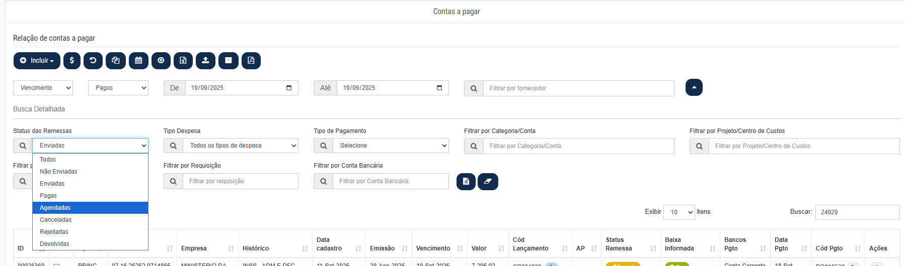 É possível, ainda, filtrar os pagamentos na tela de Contas a Pagar, por meio do status da remessa. Para isso, utilize os filtros avançados, tal como indicado abaixo: